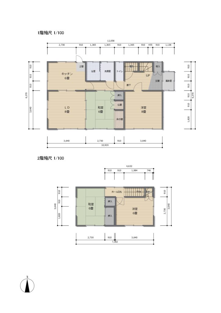 | 間取り | 5DK+車庫 1F:DK・洋室×2・和室 2F・洋室・和室 | ||||||||||||||